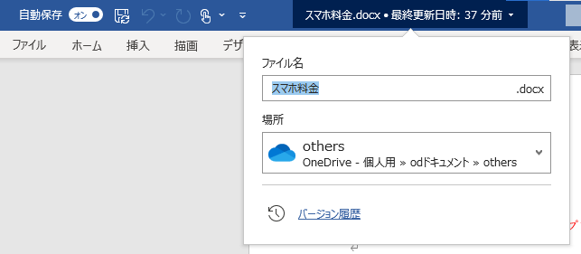 まず、バージョン履歴を確認したいファイルを開きます。そして、ファイル名のところをクリックします。次に「バージョン履歴」をクリックします。
