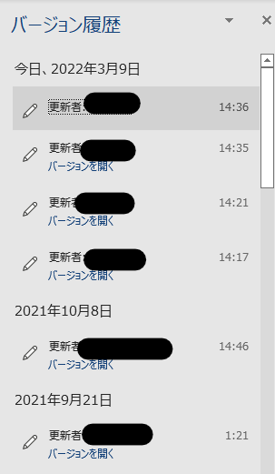 確認したい日付の「バージョンを開く」をクリックしてバージョン履歴を確認することができます。